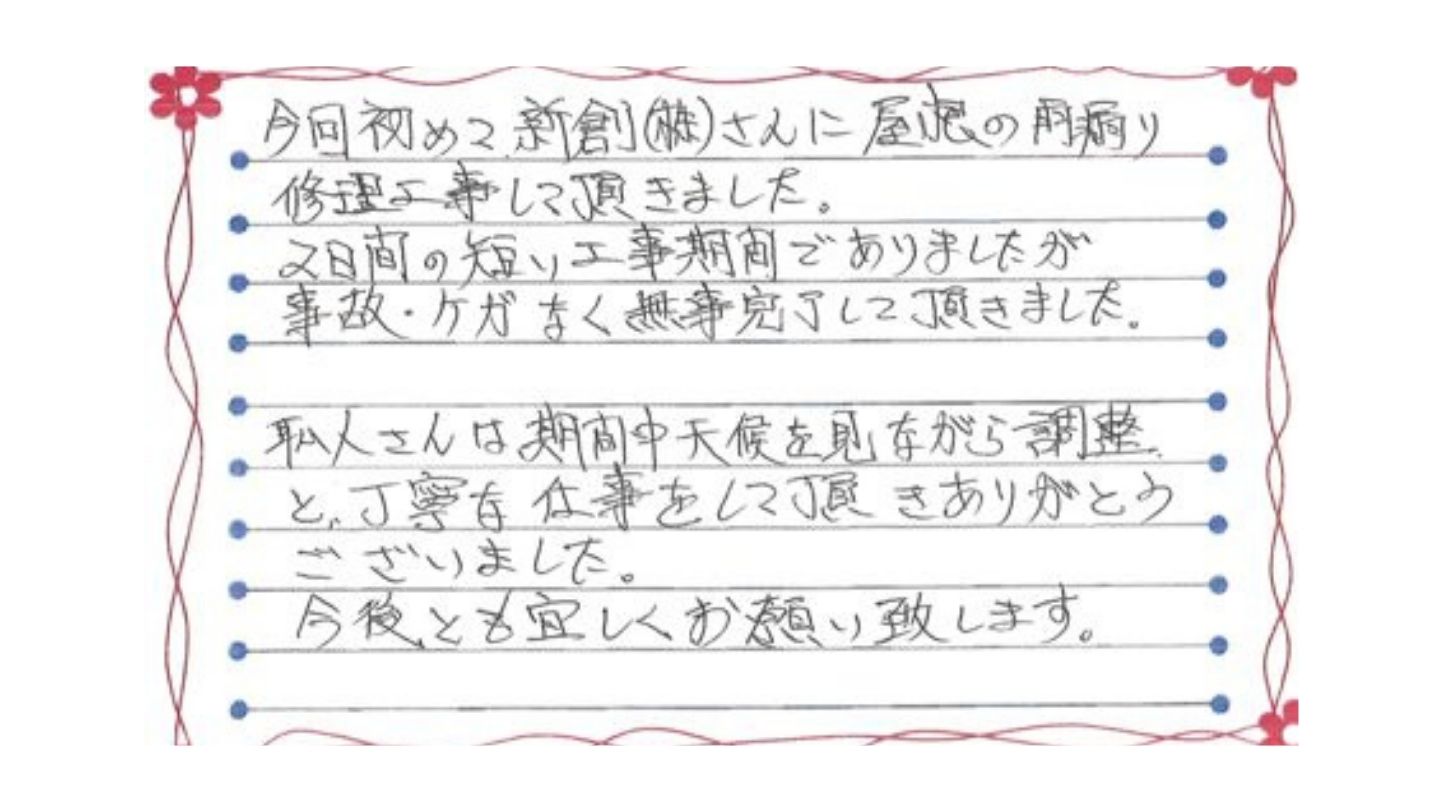お手紙をお寄せいただき、誠にありがとうございます。初めてのご依頼先として新創株式会社をお選びいただき、屋根の雨漏り修理工事をお任せいただけたこと、代表として心より感謝申し上げます。また、工事を終えたあとに、このような温かいお気持ちを手書きでお伝えいただけたことは、私たちにとって何よりの励みです。