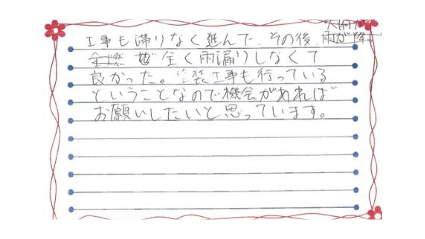 お手紙をお寄せいただき、誠にありがとうございます。工事が滞りなく進み、その後の大雨でも雨漏りが一切なかったとのお言葉を拝見し、代表として安堵すると同時に、大変うれしく思っております。屋根に関わる工事は、完了直後ではなく「雨が降ったあと」にこそ、本当の評価をいただくものです。その点で安心していただけたことは、現場に携わった職人一同にとって何よりの励みになります。