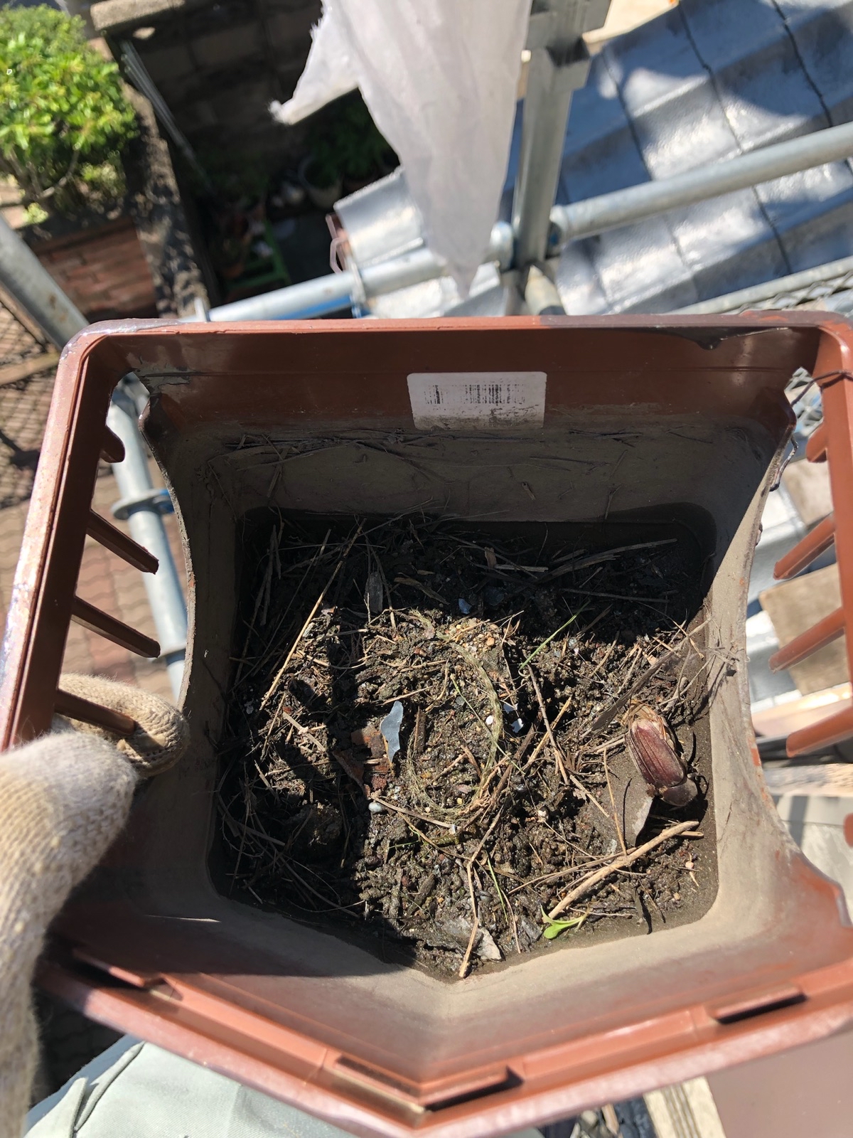 雨樋の集水器の下部分です。ゴミなどが詰まっているのが見えます。