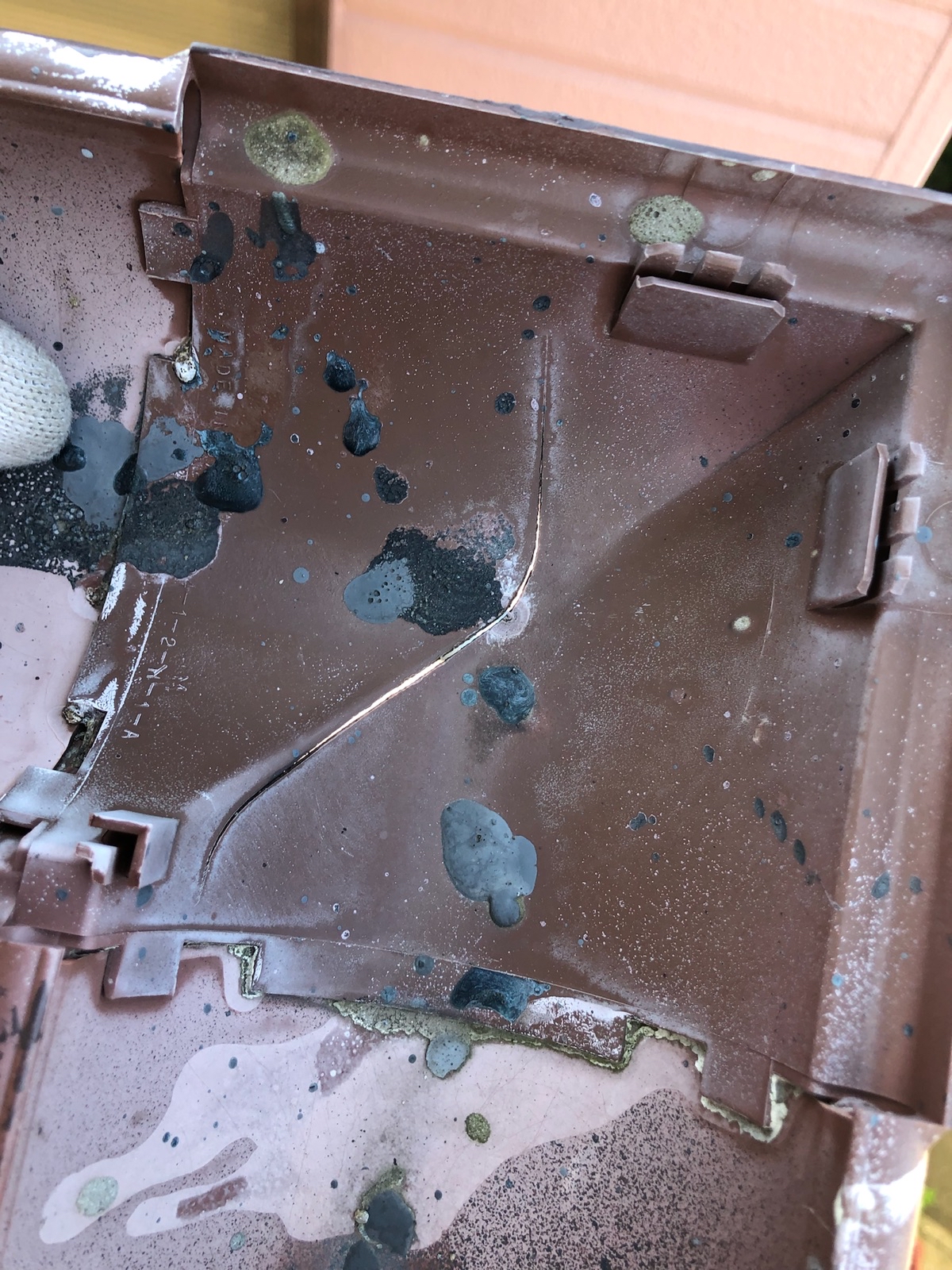 雨樋の四つ屋根と呼ばれている部分です。無理がかかったと思われる平曲が1カ所割れていました。これは軒樋の伸縮の力の逃げ道になる部分が作られてなかったためです。